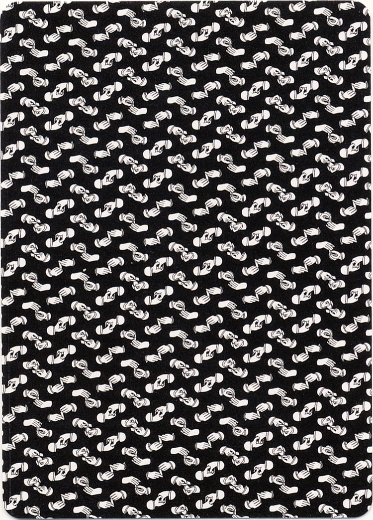 We are now releasing the first design and color in what will be a series. It is the Black Smith Back named in honor of Marshall D. Smith the illustrator of The Expert at the Card Table. The overall Bee like pattern is actually made up of tiny reproductions of the hands in the illustrations of the great card classic. These decks also use the original faces that were used by U.S. Playing Card Co. in 1902. These great faces have somewhat larger pips and somewhat smaller indices which combine to create an unusually attractive face.